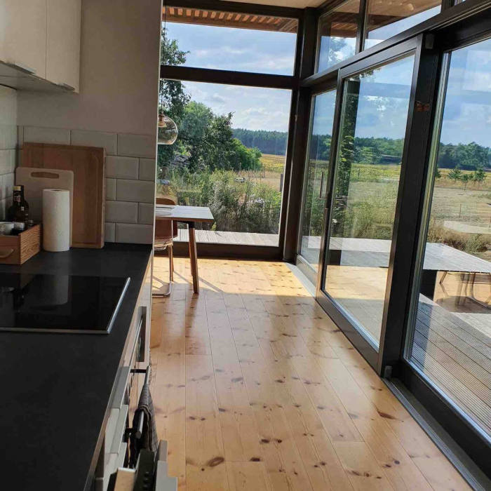 Das schöne Design Holzhaus in der Märkischen Schweiz (50 km von Berlin) befindet sich in dem kleinen Künstlerdorf Ihlow, und bietet auf 65m² Wohnfläche mit einer großen Fensterfront und 35 m² überdachter Terrassenfläche einen wunderschönen Blick auf Felder und Wälder. Es gibt einen großen Wohn-, Ess- und Kochbereich mit einem Holzofen, sowie zwei Schlafzimmer (1 Zimmer mit Doppelbett und 1 Zimmer mit Schlafcouch für 1 Person) und ein Bad. In beiden Schlafzimmern befindet sich zusätzlich eine Infrarotheizung.